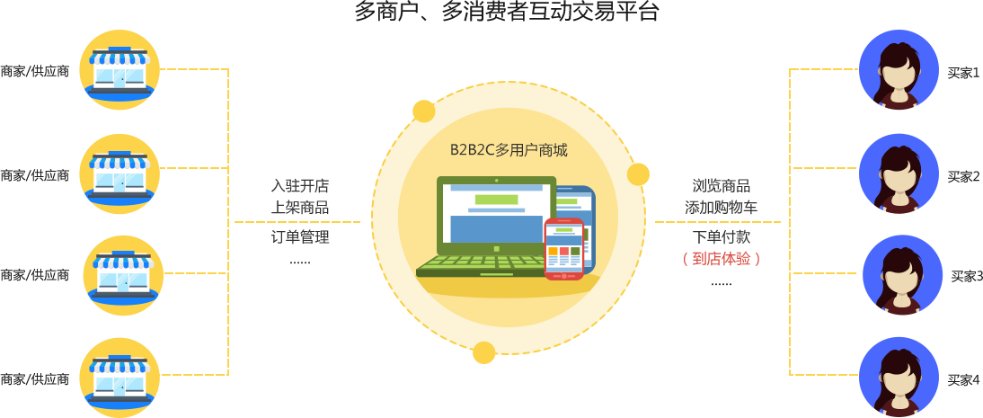 (2)多商家商城系統(tǒng)企業(yè)通過(guò)代銷或者直銷的方式,將伙伴供應(yīng)商資源納入B2B2C平臺(tái)自營(yíng)體系建立多個(gè)自營(yíng)店鋪,多樣化商品和服務(wù)品類,整合行業(yè)資源;