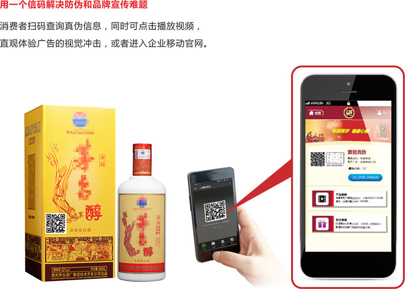 每瓶酒都擁有一個(gè)****的商品身份證,防偽標(biāo)簽對(duì)應(yīng)的商品信息是經(jīng)過多重加密的數(shù)據(jù),仿冒者無法解讀數(shù)據(jù)內(nèi)容。在防偽溯源的同時(shí),還加入數(shù)字營銷元素。給消費(fèi)者提供在線購買入口,查找周邊門店,查看促銷信息,領(lǐng)取抵扣紅包,優(yōu)惠券服務(wù),還給想了解其他產(chǎn)品的消費(fèi)者提供產(chǎn)品推薦,提供客服聯(lián)系方式,零距離接觸用戶。