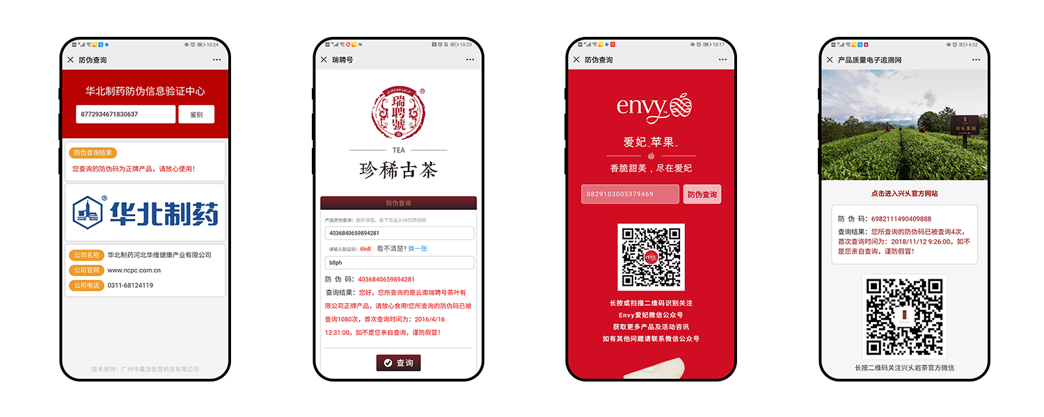 《時(shí)匆防偽物聯(lián)網(wǎng)信息查詢系統(tǒng)》是全國(guó)少有的通過國(guó)家質(zhì)檢總局防偽技術(shù)評(píng)審認(rèn)證的防偽系統(tǒng)之一,綜合運(yùn)用了計(jì)算機(jī)技術(shù)、數(shù)據(jù)庫技術(shù)、加密技術(shù)、印刷技術(shù)、通信網(wǎng)絡(luò)技術(shù)、語音轉(zhuǎn)換技術(shù)等,利用INTERNET、400電話、短信以及掃碼平臺(tái)端等方式,通過數(shù)據(jù)庫存取技術(shù)將這些信息和數(shù)據(jù)庫進(jìn)行對(duì)比并將處理結(jié)果傳遞給客戶,提供商品真?zhèn)蔚南嚓P(guān)信息,并可實(shí)時(shí)追蹤來電號(hào)碼或IP地址、日期、時(shí)間、查詢內(nèi)容、查詢結(jié)果等,并且自動(dòng)生成報(bào)表,供企業(yè)查看分析。